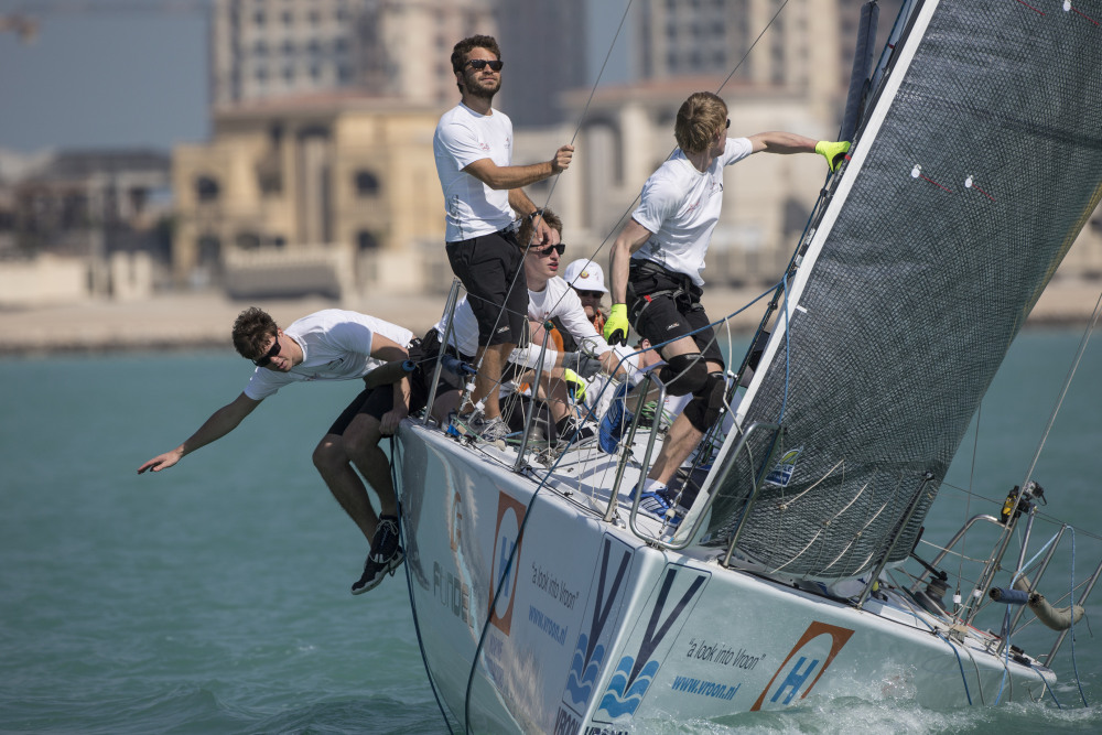 After a day off of fun on Valentine’s Day, the third leg from Abu Dhabi was seventy nautical miles and was raced in full sun. TDC came into port to find many Dutch fans watching. They finished in fourth place and were very tired. In the following races TDC climbed the rankings with a third in the offshore to Ras Al Khamah, two second places in short inshores and in the final inshore toped the leader board.