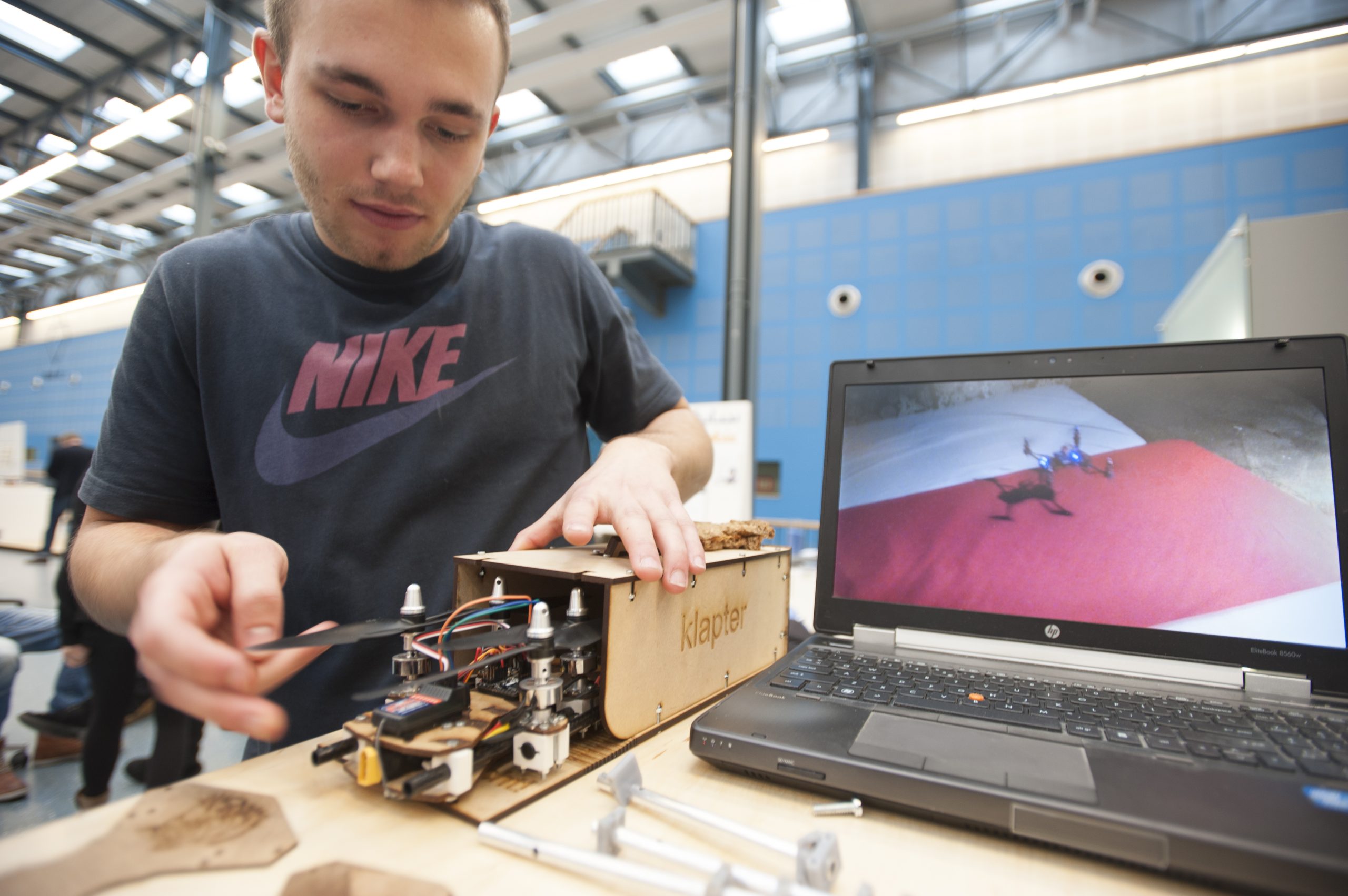 Waar zijn medestudenten zich meestal aan de opdracht sieraden te ontwerpen hielden, mocht hij iets totaal anders doen. “Ik wilde gewoon graag eens een drone bouwen. Deze is gemakkelijk aan te passen aan je eigen wensen en relatief goedkoop, 200 euro. Je kunt hem besturen met je smartphone.” Op zijn laptop laat de student zien hoe dat eruit ziet. In het echt kan dat even niet. Eén dag voor de eindpresentatie vloog de Klapter tegen een muur en verloor hij een klein stukje van een propeller.