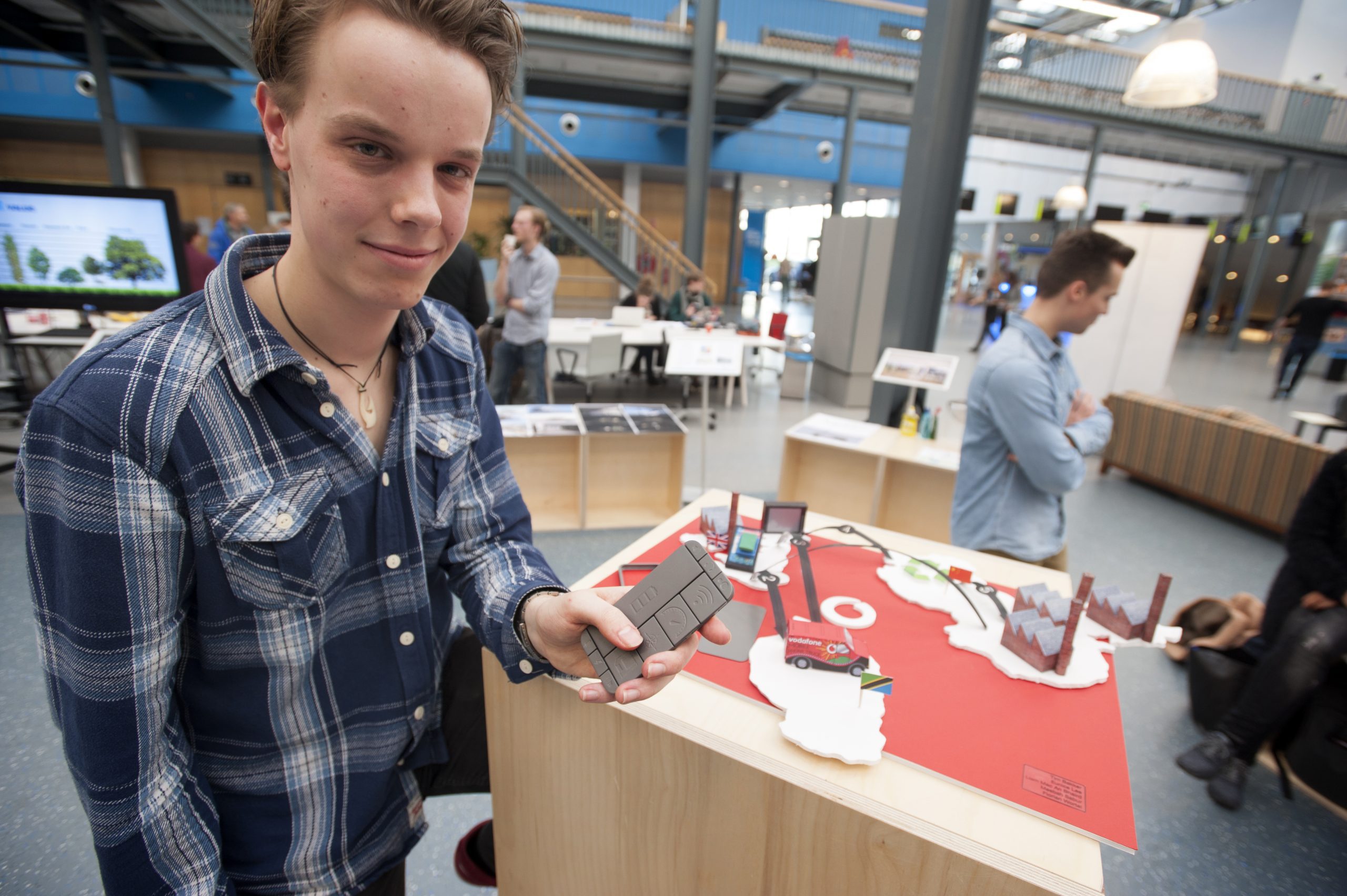 Het ontwerp van student industrieel ontwerpen Florian Wortel en zijn vier teamgenoten verkeert nog veel meer in de conceptfase. Voor de minor sustainable design engineering ontwierpen zij een modulaire telefoon, waarvan de losse onderdelen vervangbaar zijn. Wortel laat met een dummie zien hoe zo’n telefoon eruit zou kunnen zien. “Zo hoeft niet het hele apparaat in een lade te verdwijnen als de eigenaar een betere camera wil”, legt hij uit. “Je klikt er gewoon een nieuwe in.”