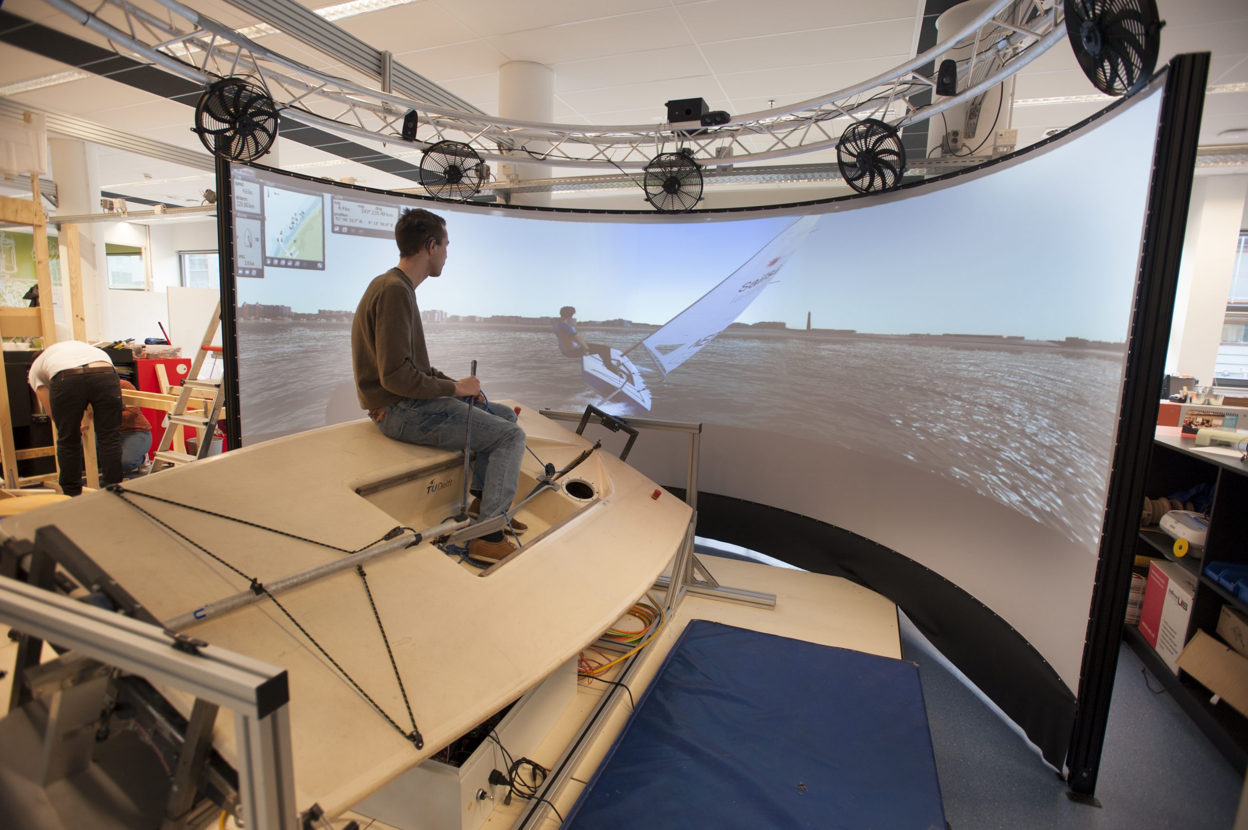 In een zaal grenzend aan de hal probeert een student verwoed om de daar opgestelde Laser-zeilsimulator van de faculteit op gang te helpen. In de boot wacht een andere student rustig tot het ding begint te schommelen. Op het ronde beeldscherm voor zich ziet hij zijn virtuele boot door het water snijden als hij het roer beet heeft.