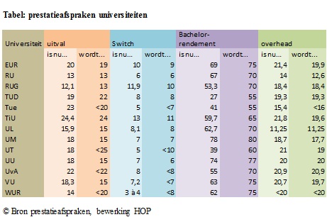 Uit de voorstellen blijkt dat de prestaties momenteel sterk uiteen lopen. Bij de Rijksuniversiteit Groningen is de uitval in het eerste studiejaar slechts twaalf procent, het laagst van alle universiteiten. De hoogste uitval zit niet, zoals misschien verwacht, bij de technische universiteiten, maar bij de Universiteit van Amsterdam (22 procent haakt in het eerste studiejaar af) en bij de Universiteit van Tilburg, waar bijna een kwart (24,4 procent) het binnen een jaar voor gezien houdt.