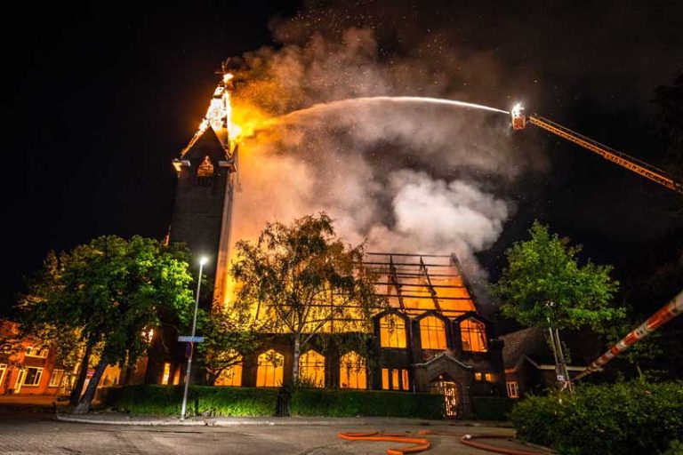 The Rijnmond news website reported on the fire the next day. ‘Rotterdam, 7 August 2017 – The Juliana Church on the Zaandijkstraat in Heijplaat almost burned to the ground on Sunday evening. The fire took hold extremely quickly and spread a lot of smoke that even blowed over the river towards the city centre. There were no victims. The top of the tower – that was made of wood – the roof and the space underneath were completely burned. Only the stone walls and the Church tower are still standing. The building is a write-off.”
