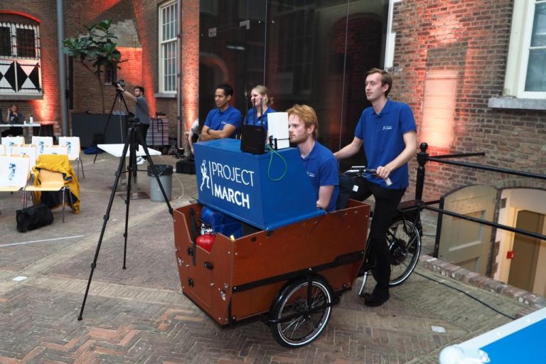 The plan was that the entry into Prinsenhof would be the culmination of a 240 metre walk along the Oude Delft with its stone paving and arched bridges. Unfortunately, a heavy rain shower passed over just at that moment, so the organisation decided to move the entire demonstration inside. On Friday, Van Zeeland had done the whole route during a dress rehearsal, Chief Engineer Eva van Houwelingen says. A support team with computer screens in a cargo bike followed him to keep an eye on the technology. All went well and the eccentric parade drew a lot of attention.