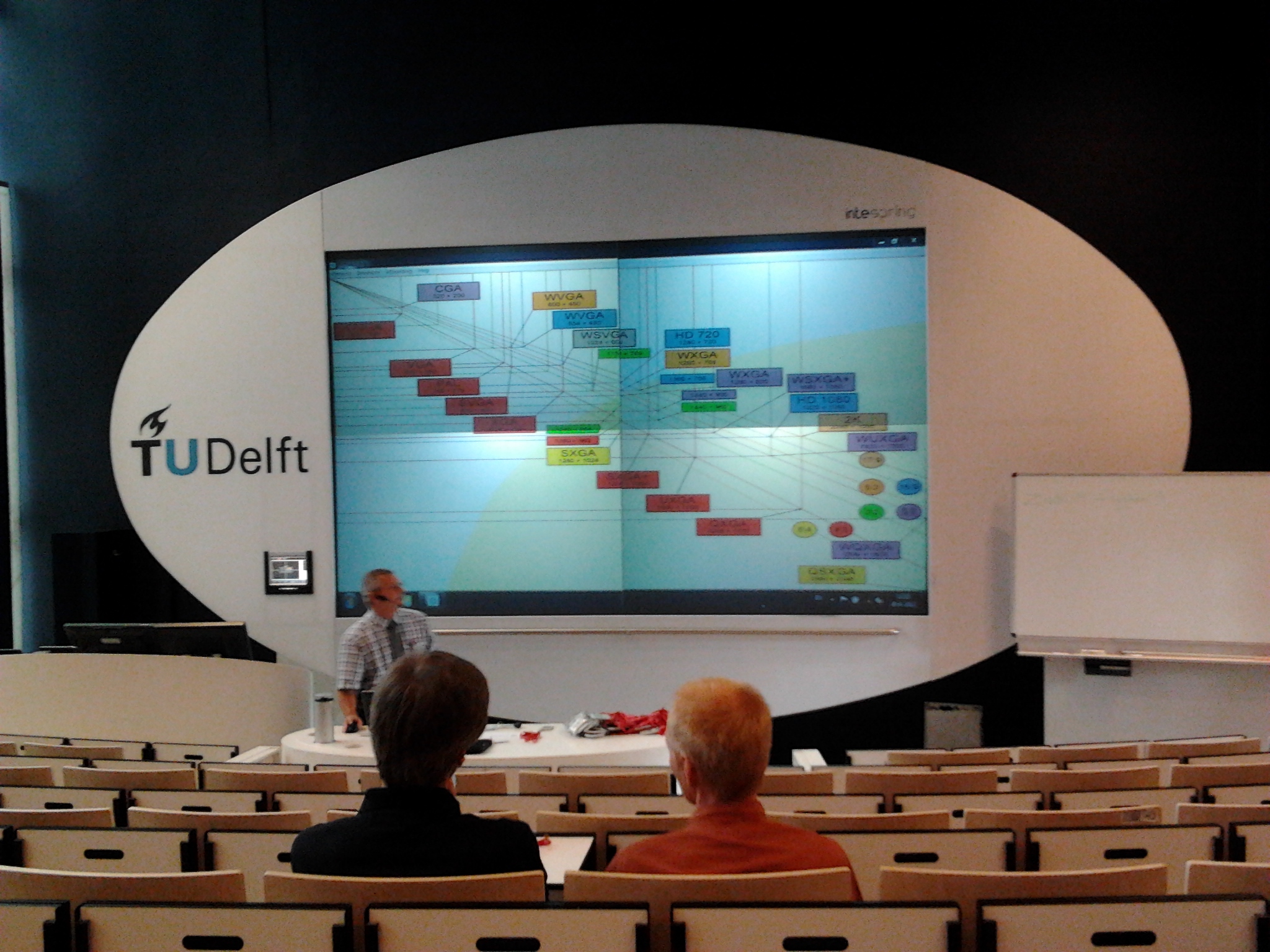 Bij de eerste test van de elektronische borden in zaal A bleek het te gaan om het huidige projectiesysteem. Dat werd in de zomer van 2010 geïnstalleerd bij de renovatie van de collegezalen van 3mE en Elektrotechniek, Wiskunde en Informatica, maar voldeed van begin af aan niet.