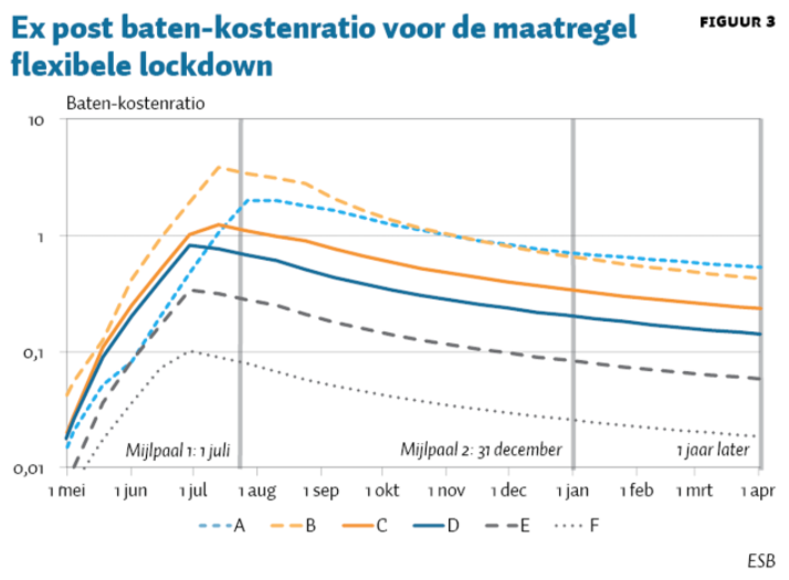 After a while, the costs of the coronameasures grow larger than the benefits. Different scenarios A to F assume different values for the virus’ mortality with 3% in cas A as maximum. (Source ESB)