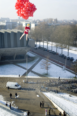 Grapjassen hebben in de nacht van woensdag op donderdag een pop met een tros heliumballonnen met vislijn vastgeknoopt aan het dak van de bibliotheek.