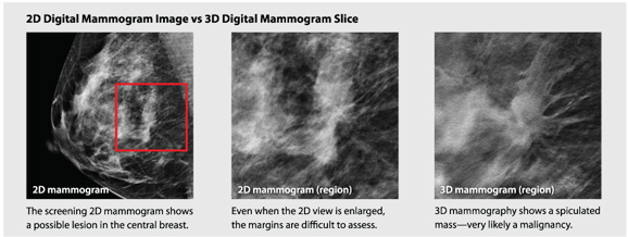 Three-dimensional images of scanned breast tissue are desirable because they help the doctor better distinguish the boundaries of structures than in a two-dimensional slice. The location of a tumor and the extent of its presence appear clearly in a 3D image.