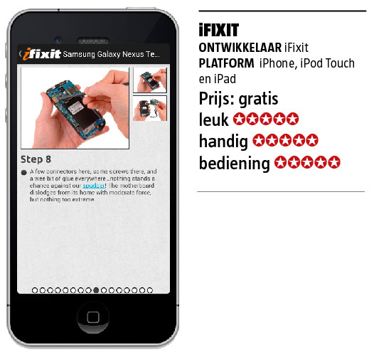 En ben je toch niet zo technisch als je opleiding doet voorkomen, dan is er altijd nog iFixit. Een app met duizenden stap-voor-stap handleidingen voor allerhande reparaties; geen TU’er bij wie dat op zijn telefoon mag ontbreken.