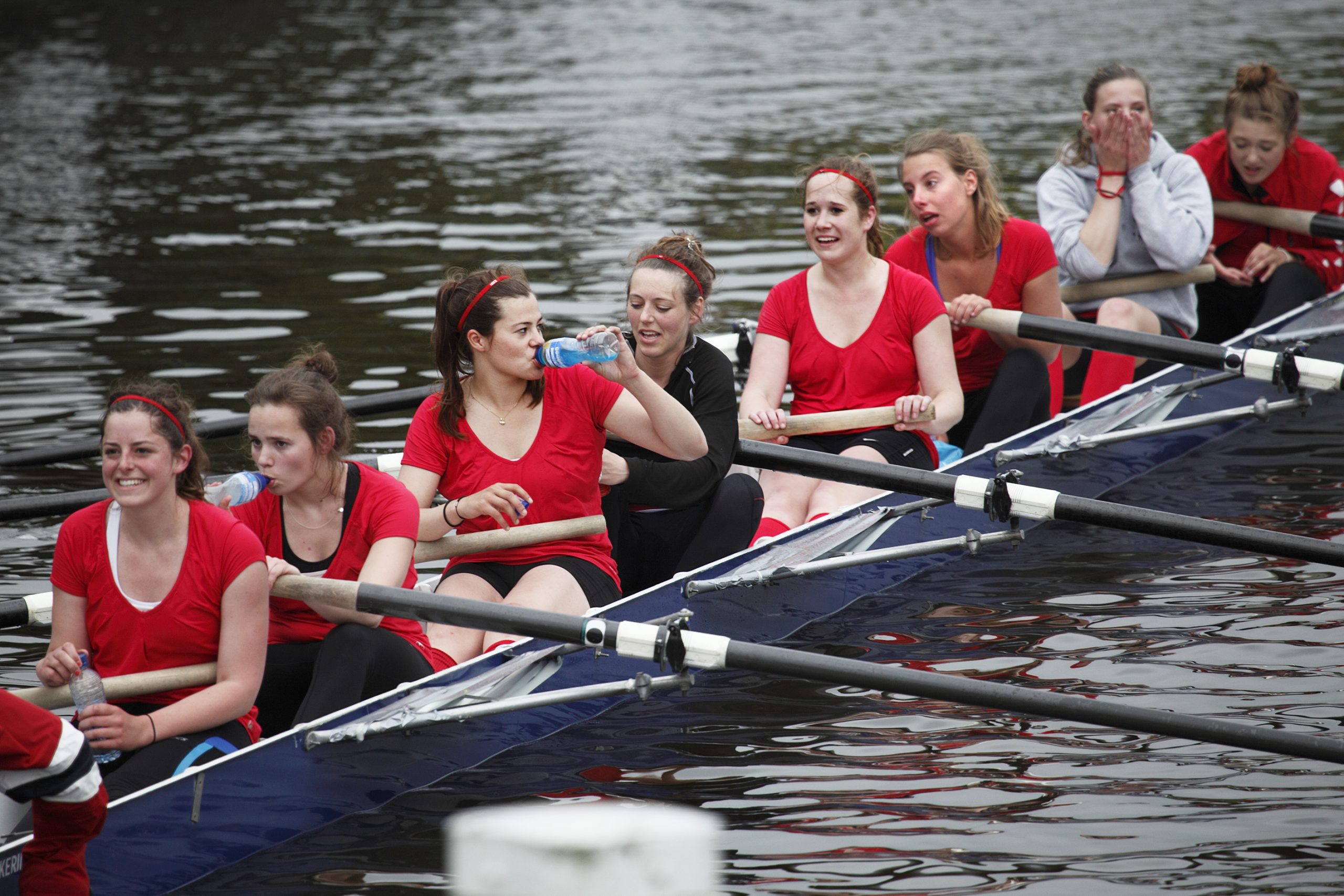 Honderd kilometer roeien achter de rug, dan mag je na de finish best even uitrusten. Moe maar voldaan, zoals dat heet. Deze damesacht was een van de 144 boten die woensdagochtend in Leiden begonnen aan de 38ste editie van de Ringvaart Regatta.