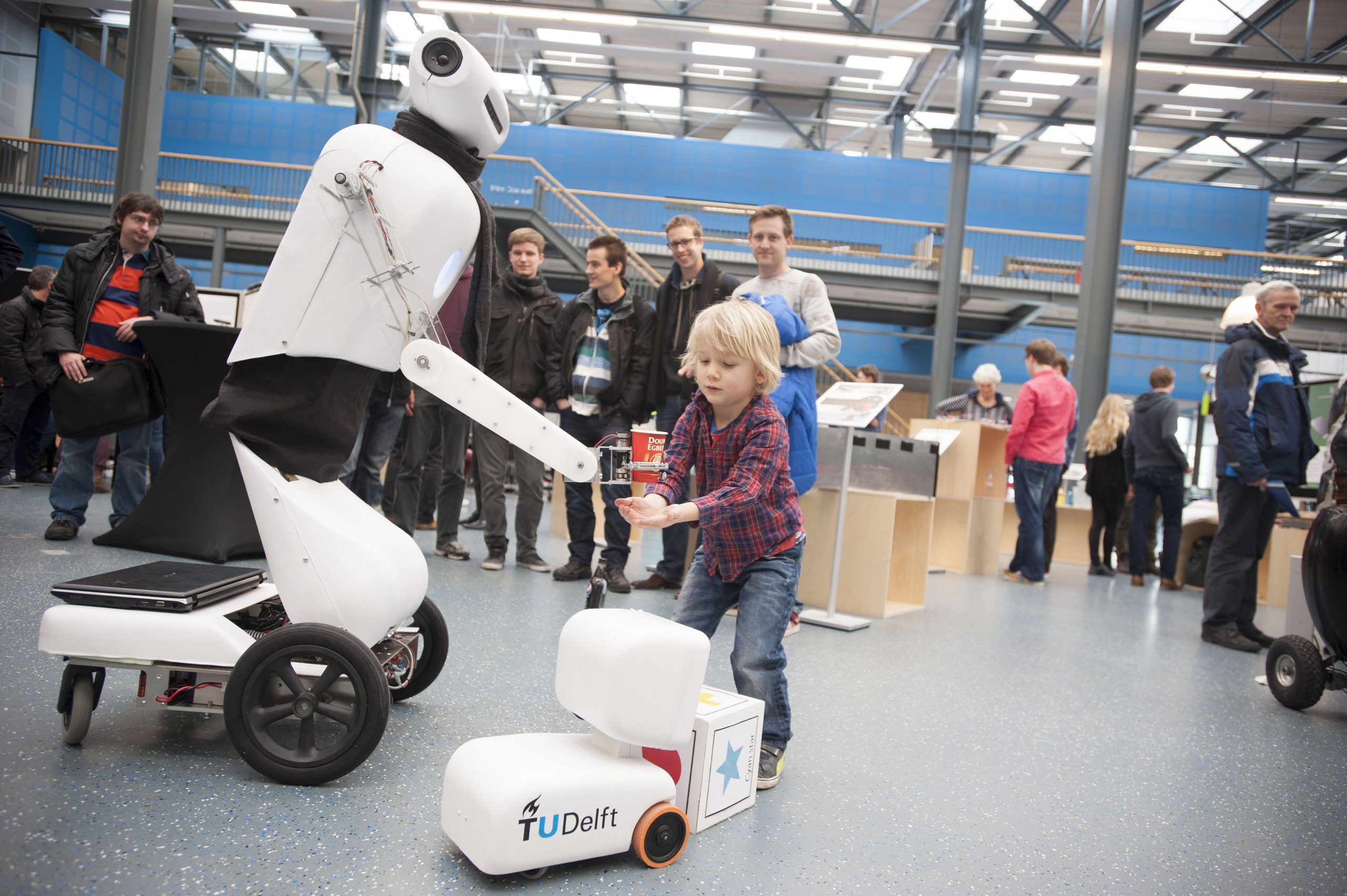 Martijn Wisse vindt dat robots ‘te veel vermenselijkt’ worden. “Het zijn gewoon machines die nog niet kunnen omgaan met de complexiteit van de echte wereld.” Hij laat een grappig filmpje zien van robots die een paar passen lopen, een deur willen openen en dan omvallen, inklappen, achterover slaan. Na de lach, komt – vermenselijking – het medelijden. ‘Ah, zielig’, zegt een vrouw op de eerste rij.