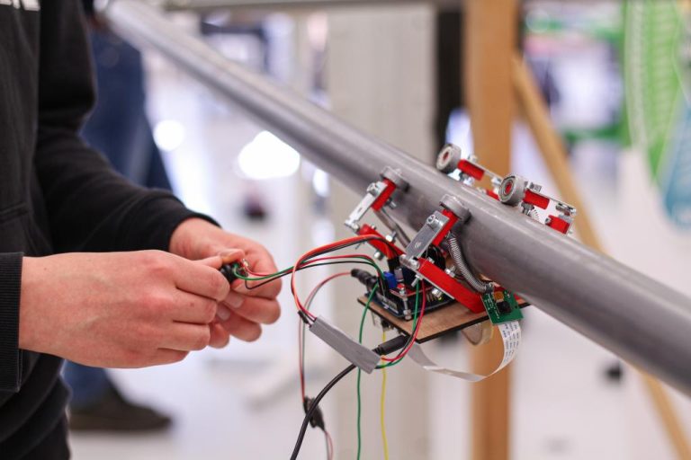 Robot builders could choose from two assignments, both of which called for an inspection robot. The company VolkerWessels asked for a robot that can inspect the overhead wires of trains to determine the degree of wear and tear. Chemical company Nobian was looking for a robot to inspect PVC pipes for damage, cracks or leaks.