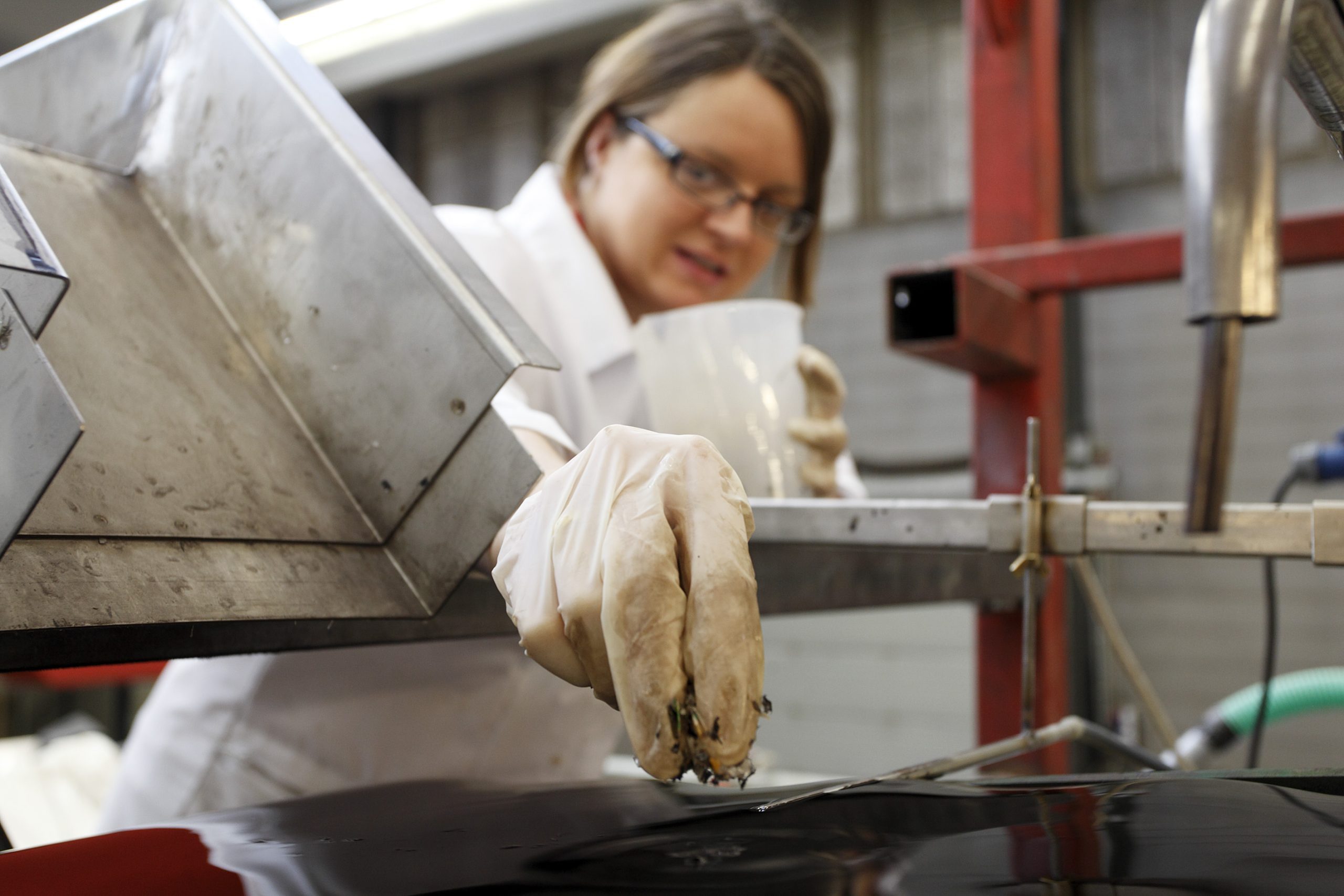 Grzech stands beside a set-up measuring 2.5 by 2 metres. She points towards a large container with small pieces of copper wire, plastic and glass. These used to be smartphones and LCD and plasma televisions. The parts are placed on a conveyor belt with a magnet underneath it. The liquid lies on top of the conveyor belt like a pudding. The belt advances at a rate of two centimetres per second.