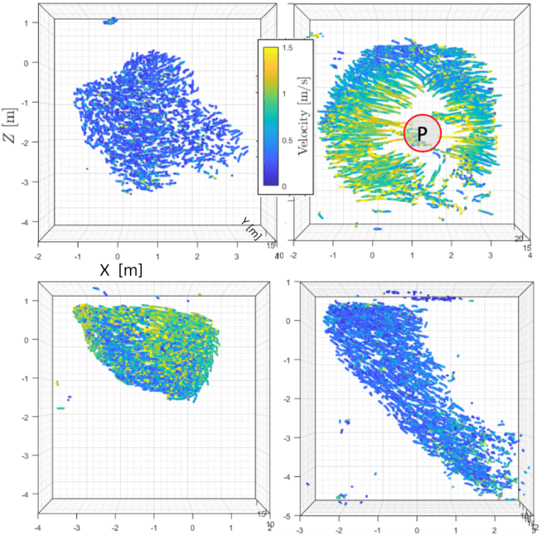 A selection of the visualised data from Muller’s dissertation. These are examples of quantitative imaging of shoaling behaviour (top left), a donut escape-response (top right, P denotes a ‘predator’ position), a ‘fish ball’ milling shape (bottom left), and finally the familiar cylindrical ‘fish tornado’.
