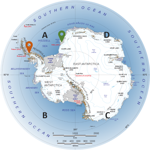 A map of Antarctica showing the four sectors, along with A74 (green marker) and A68 (red marker) ice shelves. (Photo: NASA in Wikipedia)