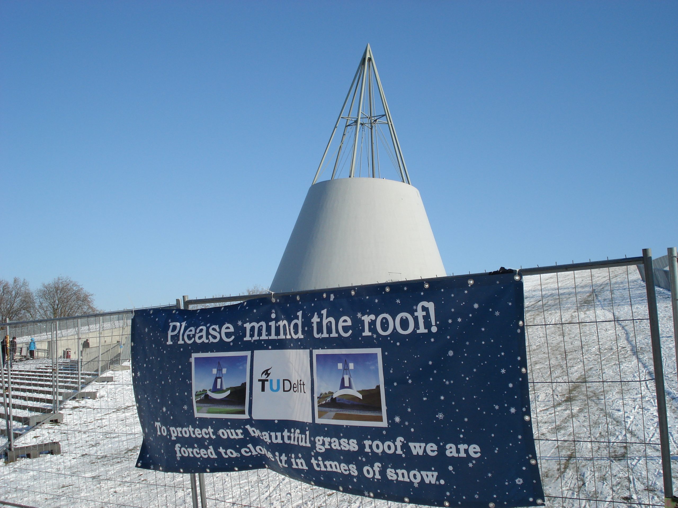 Om te voorkomen dat het grasdak van de TU Delft Library de winter niet overleeft, is het vrijdag bij de eerste sneeuwval afgesloten met hekken. Dan zou er niet gesleed moeten kunnen worden. Maar hoe komen die sleesporen daar dan?