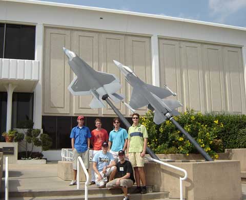 De studenten luchtvaart- en ruimtevaarttechniek die afgelopen jaar stage liepen bij Lockheed Martin in Forth Worth Texas, voor het gebouw van de vliegtuigfabrikant. Vlak achter hen staan modellen van de F16 en de Joint Strike Fighter. Van linksboven naar rechtsonder: Jasper Brouwers, Sjoerd Lincklaen Arriëns, Florian van Rijn van Alkemade, Joost van Tooren, Joris Grotenhuis en Rudy van Steen. (Foto: Lockheed Martin Aeronautic)