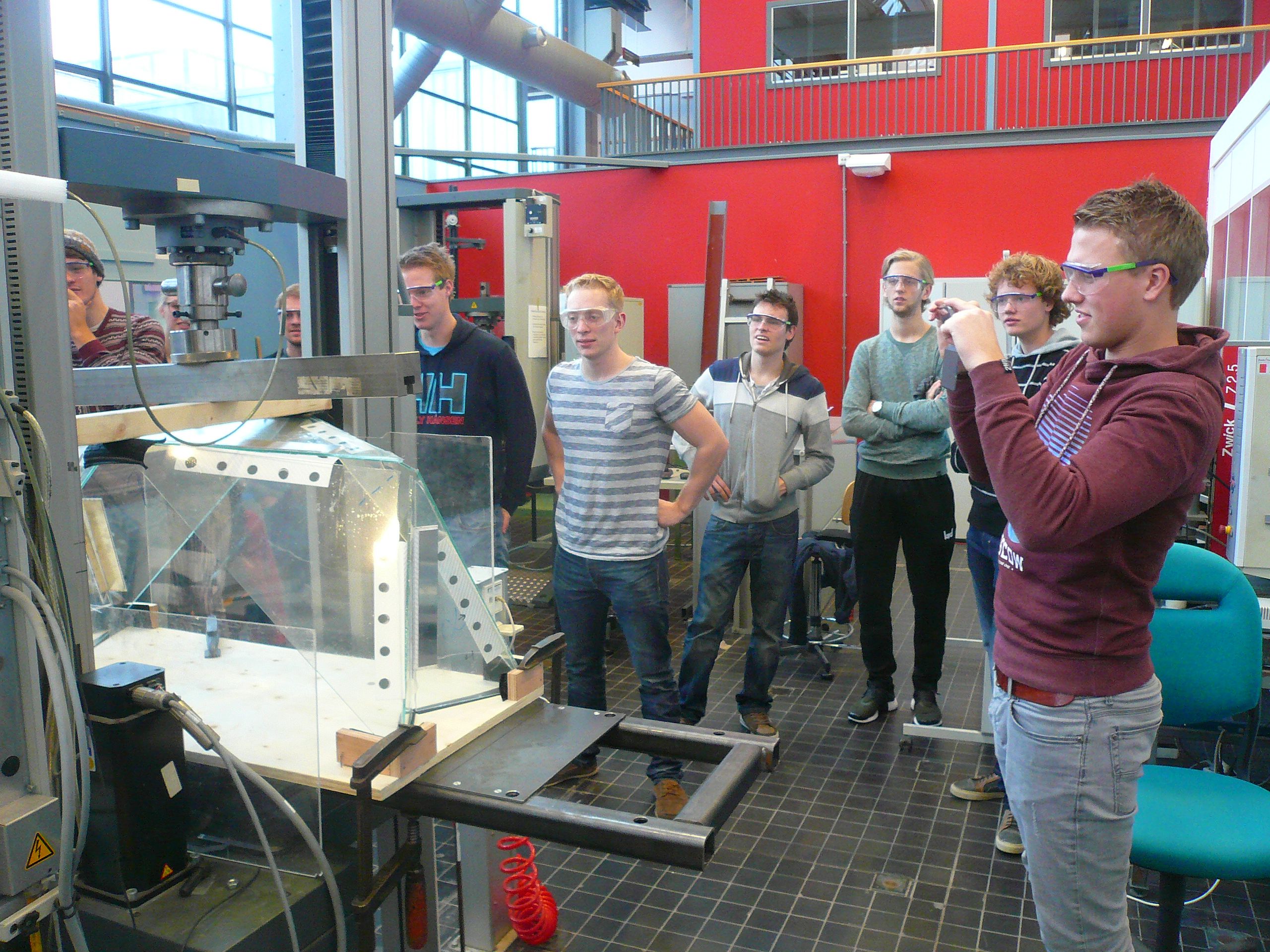 Students get to make constructions with steel, concrete, wood or glass. Lectures on analytical and numerical models should help students to predict the behaviour of their construction. All built constructions will be tested, often catastrophically so.