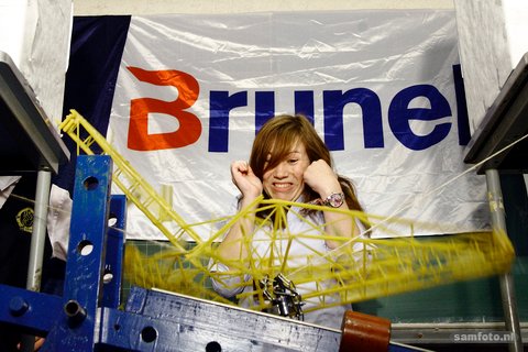 Ook was er een teambouwwedstrijd, waarbij teams van twee tot vier studenten op de wedstrijddag een opdracht kregen die binnen enkele uren in elkaar gezet moest worden. Hier deden dertien teams aan mee en maar liefst negen bruggen konden een treintje van 4,5 kilo dragen. Het meisje op de foto komt uit team ‘Mac & Cheese’ en heeft de schoonheidsprijs onder studenten gewonnen.