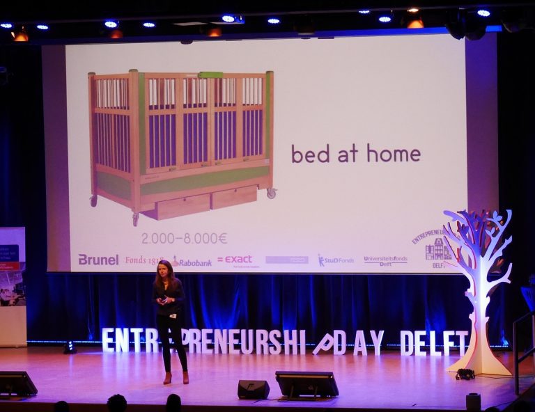 Lotte Leufkens, CloudCuddleThe symposium was kicked off by Lotte Leufkens, co-founder of the start-up Cloud Cuddle. Leufkens was studying mechanical engineering at TU Delft when she met the father of a severely disabled child. His child could not sleep in normal beds because of his epilepsy, so Lotte vowed to design a bed that was safe and portable, to give parents of severely disabled children more freedom. The ball started rolling, and now Cloud Cuddle is a successful start-up, the product is officially on the market and Lotte won the TEDx Women Startup Award. Her message to the audience is that if you have a good idea that you believe in, you can do it, even if you are a student with little money. And she realised something else: investors do not primarily invest in the idea itself, but they invest in you! If you can show them you have the determination and the belief in your idea, you are a long way there.