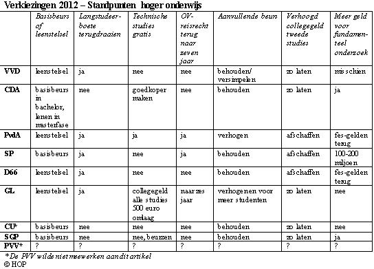 Maar of het daarbij blijft is de vraag. Na de verkiezingen zal er onderhandeld moeten worden over een regeerakkoord. En wie de voorlopige verkiezingsprogramma’s bestudeert ziet dat een flink aantal partijen de basisbeurs wil afschaffen.