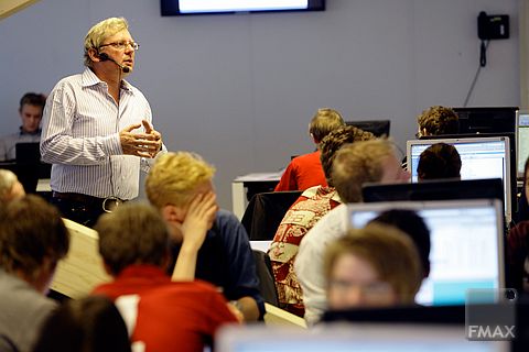 Er zijn die dag twee sessies: een om half negen en een om half elf. De laatste is het drukst bezocht. Met 110 studenten zit de studio in het nieuwe onderwijsgebouw goed vol. Door de hele ruimte staan 26 tafels opgesteld met aan beide zijden een computer en plaats voor twee of drie studenten. Voorin de zaal bedient Van Bussel de computer die sheets en sites projecteert op zestien grote schermen die overal in de studio classroom zijn opgesteld. Een headset met microfoontje geeft hem bewegingsvrijheid om door de zaal te lopen en bij iedere tafel te kijken hoe de studenten het er van af brengen. Daarbij moet hij wel af en toe bukken voor de diagonale balken die midden door het lokaal lopen. Constructiefoutje van de bouwers.