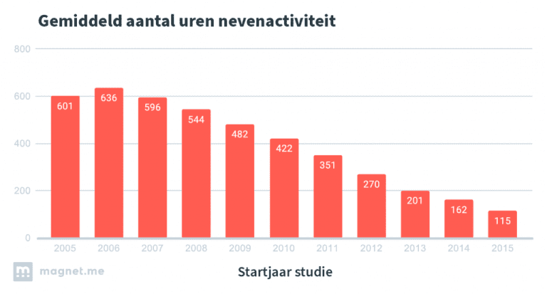 Studenten die in 2005 begonnen met studeren besteedden naast hun studie gemiddeld ruim 600 uur aan bestuurs- of vrijwilligerswerk. Voor studenten die in 2015 startten met studeren en afstudeerden in 2019 of 2020, ligt dit cijfer op 116 uur. Het aantal uren bestuurs- of vrijwilligerswerk daalt al jaren achtereen: