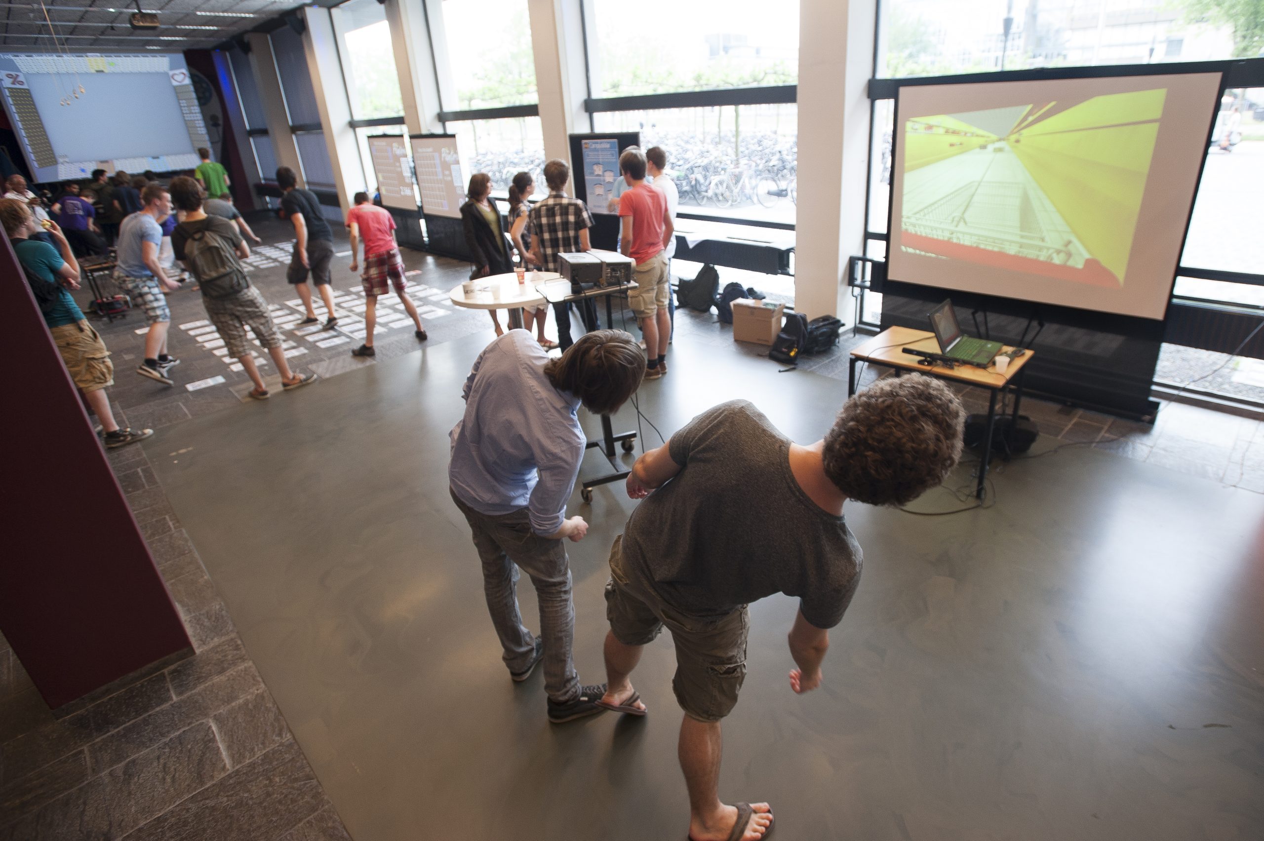 Binnen het tweedejaars Computer Games Project kregen studenten van coördinator dr.ir. Rafael Bidarra (EWI) de opdracht een game te maken waarmee een wachtende menigte zich kan vermaken. Na veertien weken ontwerp en ontwikkeling waren op 19 juni vier spelen klaar voor presentatie aan belangstellenden, en dat werden er alsmaar meer in de EWI-hal.
