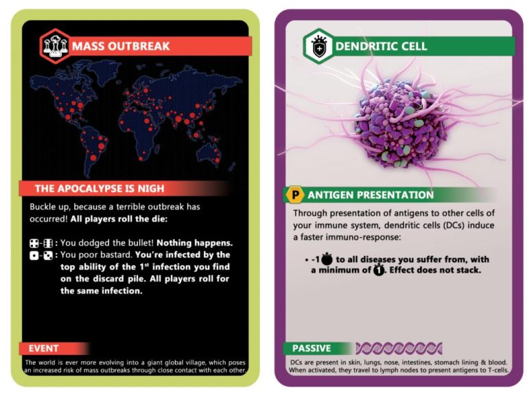 “In October 2019, Dennis and I talked about how much fun it would be to play a game in our own subject area,” says Rafael. “Then we found out that there only a few games that covered the immune system and the existing pathogens.” Dennis continues. “We thought this odd. There are all sorts of games with monsters, orcs, dragons, aliens and so on, so why was there nothing as close to us as our own cells, immune system, and real ‘monsters’ such as pathogens?” Rafael adds that “There is such a wide range of pathogens – parasites that penetrate your cells, fungi, viruses, and bacteria. How they attack your cells and how your immune system defends itself – with or without external aids such as medicines and vaccinations – can be compared to a police officer chasing a crook. One of the soldiers of your immune system, the macrophage for example, hunts down cancer cells, just like an American TV car chase. If you look through a microscope, it looks like you are hanging above a speeding highway chase in a helicopter.”