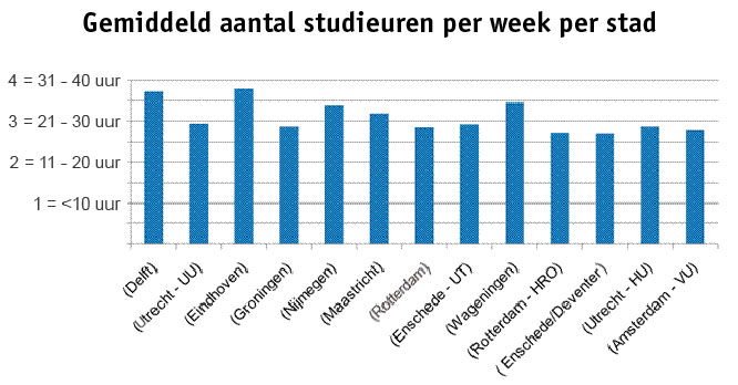 Delftse studenten blijken net als hun collega’s van de andere technische universiteiten wekelijks gemiddeld meer studie-uren te maken dan studenten van ‘gewone’ universiteiten en hogescholen (zie tabel). 36 Procent zegt wekelijks tussen de 31 en de 40 uur te studeren (dat is inclusief contacturen). 26 Procent gaat over de 40 uur heen. Een kwart komt uit tussen de 21 en de 30 uur, 9 procent houdt het bij 11 tot 20 uur en 4 procent maakt zich ervan af met minder dan 10 uur.