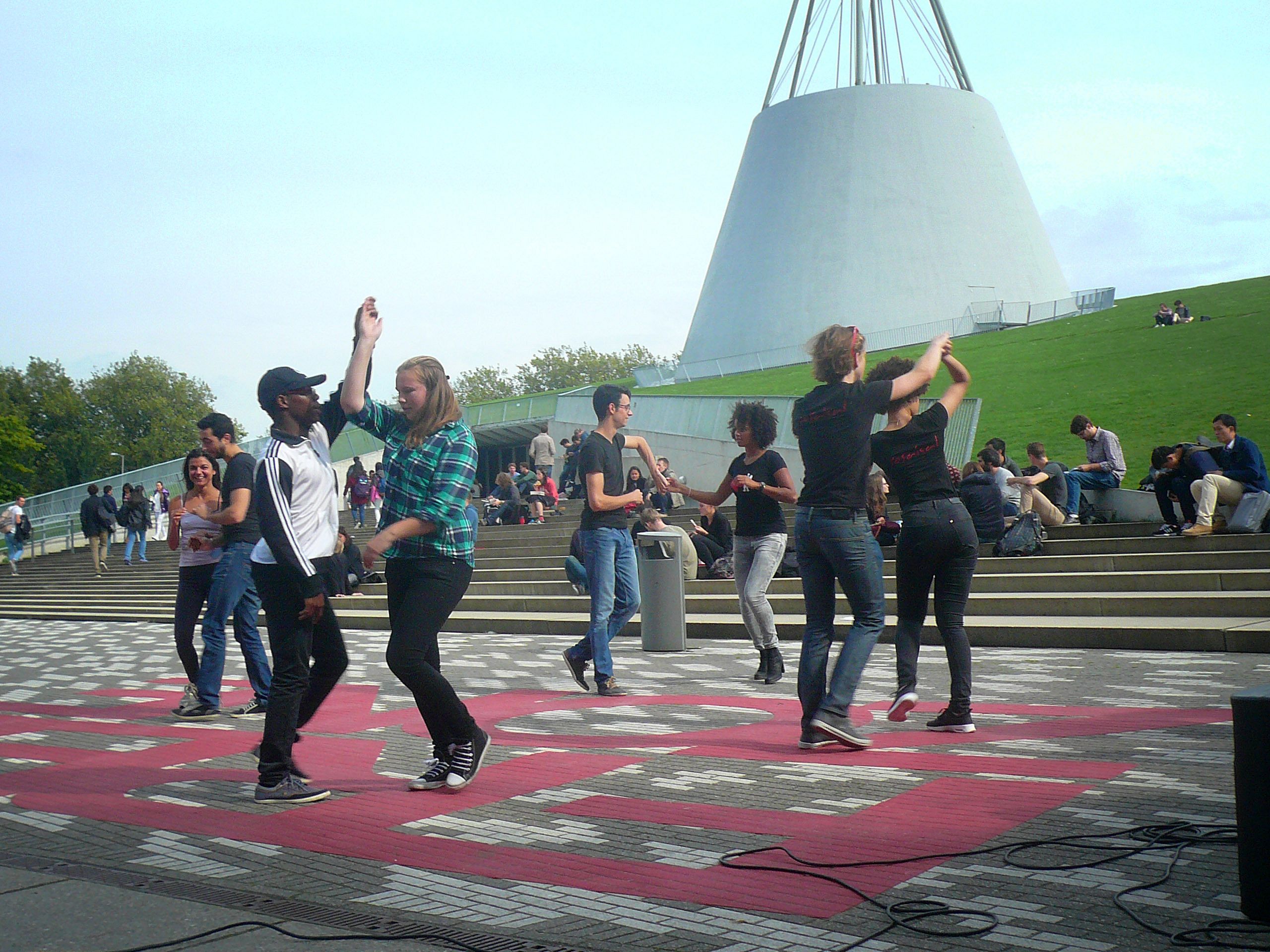 Latijns-Amerikaanse sferen vandaag op de Freezone voor de TU Delft Library. Leden van SoSalsa probeerden al dansend studenten te verleiden tot de salsa.