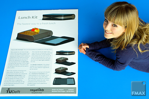 Royal VKB, het bedrijf voor wie ze haar bachelor-eindopdracht ontwierp, maakt keukengerei in alle soorten en maten. Een beetje afbakenen was dus wel nodig voordat ze aan het ontwerpen sloeg. “Ik wilde iets maken om het onderweg eten te vergemakkelijken. En lunch is meestal de maaltijd die je niet thuis eet.” Ze besloot zich te richten op zakenlui. Of liever: mensen met een druk bestaan die ’s ochtends geen tijd hebben om een verse lunch te bereiden, maar wel goedkoop en lekker willen eten. “Dus bedacht ik de Lunch Kit, met ruimte voor de ingrediënten, bestek én een geïntegreerde placemat om de lunch ter plekke op te bereiden.” En hij ziet er hartstikke hip uit, met zijn aluminium box en rubberen buitenkant. “Hij is veel strakker dan de lunchboxen die nu op de markt zijn”, constateert de IO’er tevreden.