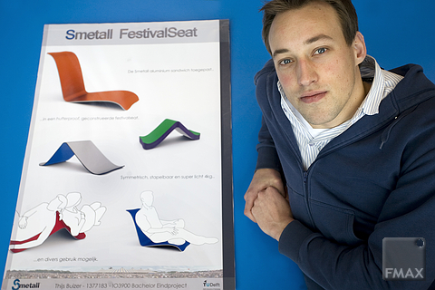 Zijn ontwerp blinkt uit in eenvoud; de Festival Seat is eigenlijk niets meer dan een gegolfde aluminium plaat. Maar niet zomaar een plaat, want het materiaal dat Buizer gebruikte is een soort golfkarton van aluminium. Het is eigendom van het bedrijf RS Developments, waarvoor hij zijn eindopdracht deed. Stijf spul, dus het was even een gok of de ergonomische vorm die Buizer zo leuk bedacht had, haalbaar was. “Ik heb eerst een concept gebouwd van karton. Dat lukte. Toen ik van RS Developments een stuk materiaal kreeg om mee aan de slag te gaan, heb ik meteen een prototype gebouwd.”