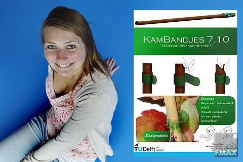 Nou dacht jij misschien dat je moe werd van het lospeuteren van de vastgeniete plasticjes die je klimplantjes aan hun tijdelijke bamboestokjes binden. Dat alleen jij vervolgens een punthoofd krijgt van het priegelen met nieuw opbinddraad om ze vast te maken aan de pergola of schutting. Maar in de gemiddelde klimplantkwekerij is het pas echt afzien. Daar werkt het personeel met loeizware nietapparaten om de zes tot zeven plasticjes per plantje vast te zetten – keer zo’n 200 duizend plantjes. “Dat lukt het eerste uur van de dag, maar in de overige zeven is dat werk niet op te brengen”, ontdekte Marieke Maas (21) voor haar IO-bachelor-eindproject. Medewerkers in die kwekerijen krijgen last van hun gewrichten en worden er in de loop van de dag niet productiever op. Tja, dát levert weer minder geld op. En dat terwijl die kwekerijen al zoveel kosten maken, alleen al door het afval dat ze produceren. “Over groenafval hoeven ze geen belasting te betalen”, weet de student. “Maar over restafval wel.” En dat is met al die opbindplasticjes en nietjes een indrukwekkende berg. Het was niet helemaal toevallig dat Natural Plastics, voor wie Maas haar eindopdracht ontwierp, al in de groenhoek zat. “Het bedrijf heeft een speciale duurzame kunststof ontworpen, die honderd procent biologisch afbreekbaar is. Alleen: het heeft nog geen producten. Toen ik ontdekte dat klimplantkwekerijen veel kunststof gebruiken, had ik mijn doelgroep snel gevonden.” Door de opbindbandjes biologisch afbreekbaar te maken, loste ze het dure afvalprobleem van kwekerijen op, maar ook nog eens het ergonomische probleem van de medewerkers. Maas: “Mijn zogenaamde kam-bandjes zitten al vast aan de opbindstokjes. Die hoeven de kwekers alleen maar om het plantje heen te trekken, en vervolgens krullen de bandjes vanzelf weer terug om het stokje. Eigenlijk net zo’n systeem als de ringbandjes waarmee je je verslagen op de TU inbindt.” Ze sloeg meteen een derde vlieg in die klap: “Consumenten kunnen de bandjes in hun eigen tuin hergebruiken om de planten op te binden, op dezelfde gebruiksvriendelijke manier. Na verloop van tijd vergaan de bandjes gewoon, en zitten de planten stevig vast.”
