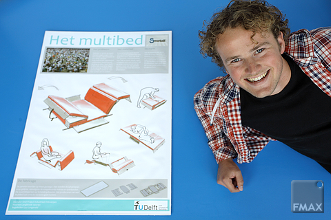 Ja dus. Maarten Langbroek (23) ontwierp voor zijn bachelor-eindproject bij IO een Multibed, een inklapbaar veldbed dat is om te bouwen tot een zitje of tafeltje. Het geeft grote groepen slachtoffers van rampen net dat ene kleine beetje persoonlijke ruimte in de noodopvang. Hij maakte het in opdracht voor RS Developments, dat nieuwe toepassingen zocht voor zijn aluminium sandwichpanelen. “Ik kwam al snel op het idee voor een toepassing in noodsituaties. Na de vulkaanuitbarsting in IJsland heb ik rondgelopen op Schiphol. Al die gestrande reizigers zonder enige vorm van privacy. Die mag je wel een beetje tegemoet komen, vond ik.”
