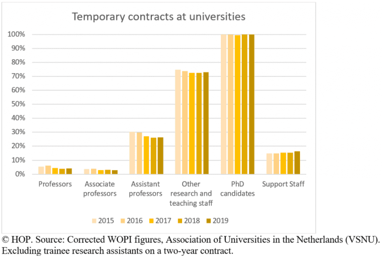All in all, 59 percent of staff at universities have a temporary appointment. Exclude PhD candidates and support staff and that figure drops to 39 percent. It is a number that has hardly changed in years.