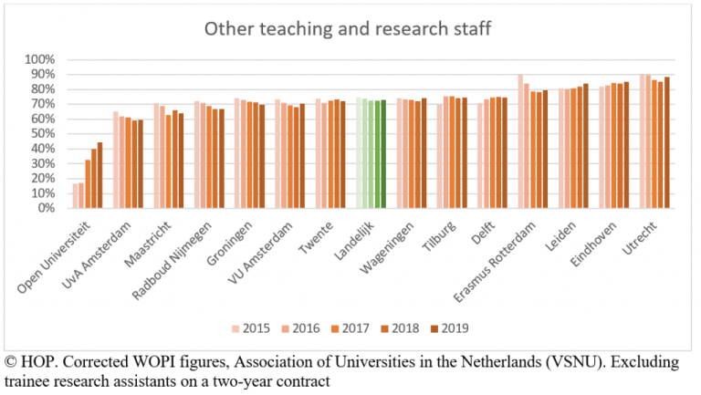 A quarter of all assistant professors continue to work on a temporary basis. The same applies to three quarters of other teaching and research staff. PhD candidates all have contracts for a set number of years; in the Netherlands that is the nature of these appointments.