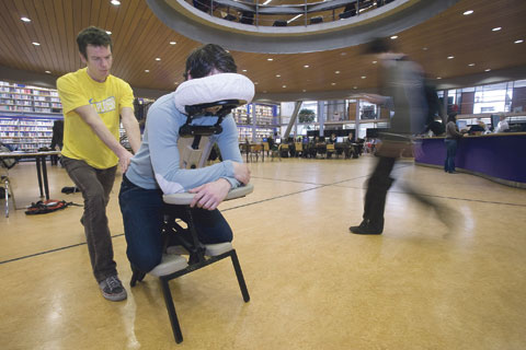 Studenten in de bibliotheek zaten woensdag niet met hun neus in de boeken, maar in de massagestoel. Geconcentreerd kneedt de masseur de tentamenstress bij oververmoeide studenten weg.