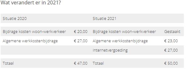 Ondanks deze veranderde situatie, werden de vaste reis- en onkostenvergoedingen doorbetaald. Per 1 januari 2021 staat de Belastingdienst het echter niet langer toe om een netto bijdrage reiskosten woon-werkverkeer aan medewerkers uit te keren.