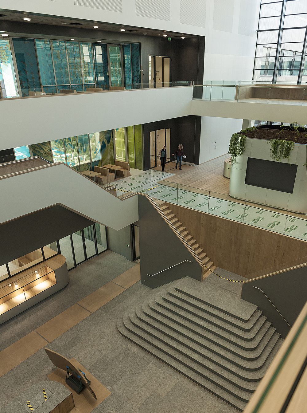 Zonder bewegwijzering ligt het gevaar op de loer te verdwalen in het 30 duizend vierkante meter tellende gebouw, blijkt tijdens een kleine rondleiding. De vrij smalle gangen maken veel bochten. Waar is nou de lift? En hoe kom je van de dienstingang het snelst in het atrium? Dat atrium is de blikvanger van het gebouw: hoog, met veel licht en natuurlijke materialen; de ruimte straalt rust uit. Een provisorisch in elkaar geknutseld bordje in de aarde naast de ‘binnenbomen’ bevestigt die rust alleen maar. “Wij hebben dorst!”, staat erop.