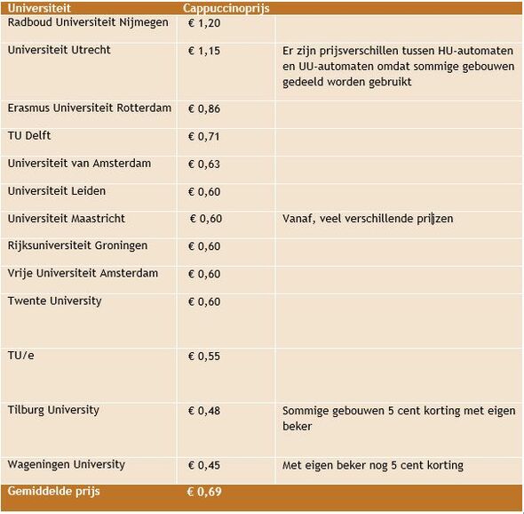 The coffee is most expensive at Radboud University Nijmegen, where you spend 1.20 euros for a cappuccino from the machine. This is followed by Utrecht University (1.15 euros) and Erasmus University Rotterdam (0.86 euros). With 0.71 euros for a cup, the Delft vending machines are good for a fourth place.