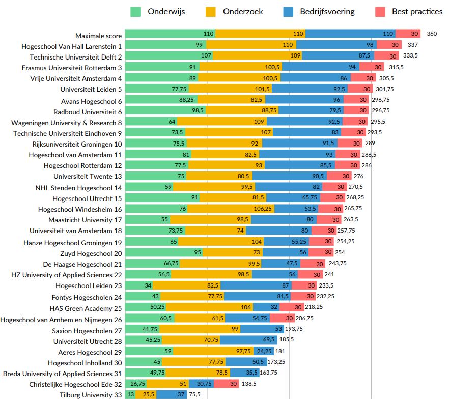 The Sustainabul was started in 2012. This is the fourth time that the University of Applied Sciences Van Hall Larenstein tops the list (see the ranking below). This academic institution has branches in Leeuwarden and Velp and won in 2020, 2022 and 2023.