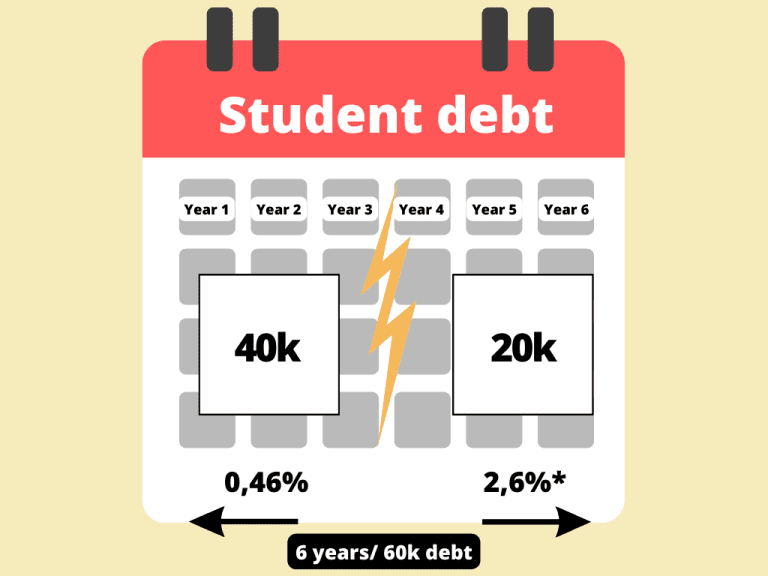 Seems straightforward so far, doesn’t it? But watch out, because now it becomes more complex. The interest that you pay in the first five years is set in the year after you stop your student loan (for example, when you graduate and no longer collect the loan). To be more precise, that happens in the so-called ‘start-up phase’, the period of two years after graduating when you do not have to pay back anything yet. Higher education students who graduate in 2022 do not fall under the rate of 2022 (0%), but under the interest percentage that comes into force on 1 January 2023 (0.46%). The interest rate van 1 January 2024 applies to anyone graduating in 2023. The interest rate of 2025 applies to anyone graduating in 2024, etc.