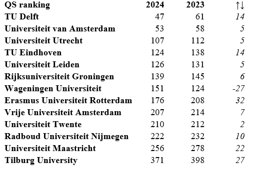 Almost all Dutch universities are gaining ground in the world rankings by British research firm QS. TU Delft rises from place 61 last year to 47 now. One reason: the makers have revamped their methodology. Among other things, the QS World University Rankings now looks at whether universities contribute to the 17 goals of the United Nations.