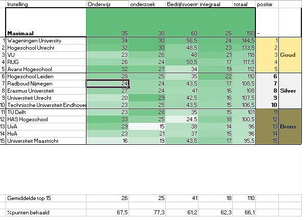 De lijst is opgedeeld in drie categorieën. De vijf instellingen met de meeste punten zijn ‘goud’, dan komen ‘zilver’ en ‘brons’. De zes instellingen die overblijven, bungelen onderaan in de categorie ‘overig’.