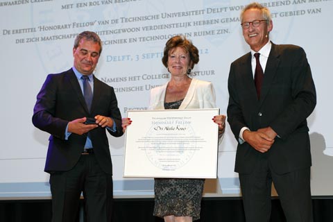 Twee prijzen werden er uitgereikt bij de opening van het academisch jaar. Neelie Kroes kreeg de eerste Honorary Award van de TU Delft uit handen van hoogleraar informatica Inald Lagendijk.