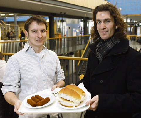 Leander Hofman (22) en Roald Piera (23), studenten industrieel ontwerpen”Vier kroketten en vier witte broodjes. Altijd als we samen lunchen, eten we hetzelfde en we betalen om en om.