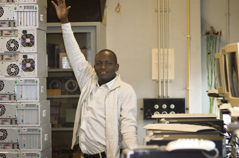 Peter Gitau, de directeur van Viafrica in Kenia die deze week op werkbezoek is op de TU, kijkt glunderend naar de machine. Honderden van soortgelijke computers worden volgende maand vervangen bij de afdelingen human resources en financiën en dat is goed nieuws voor scholieren in Afrika.