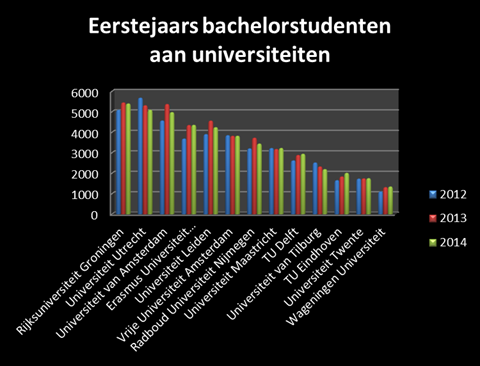 Landelijk daalde het aantal eerstejaars juist met 2,4 procent. De sterkste daling (meer dan zeven procent) voltrok zich bij de Radboud Universiteit Nijmegen, de Universiteit van Amsterdam en de Universiteit Leiden.