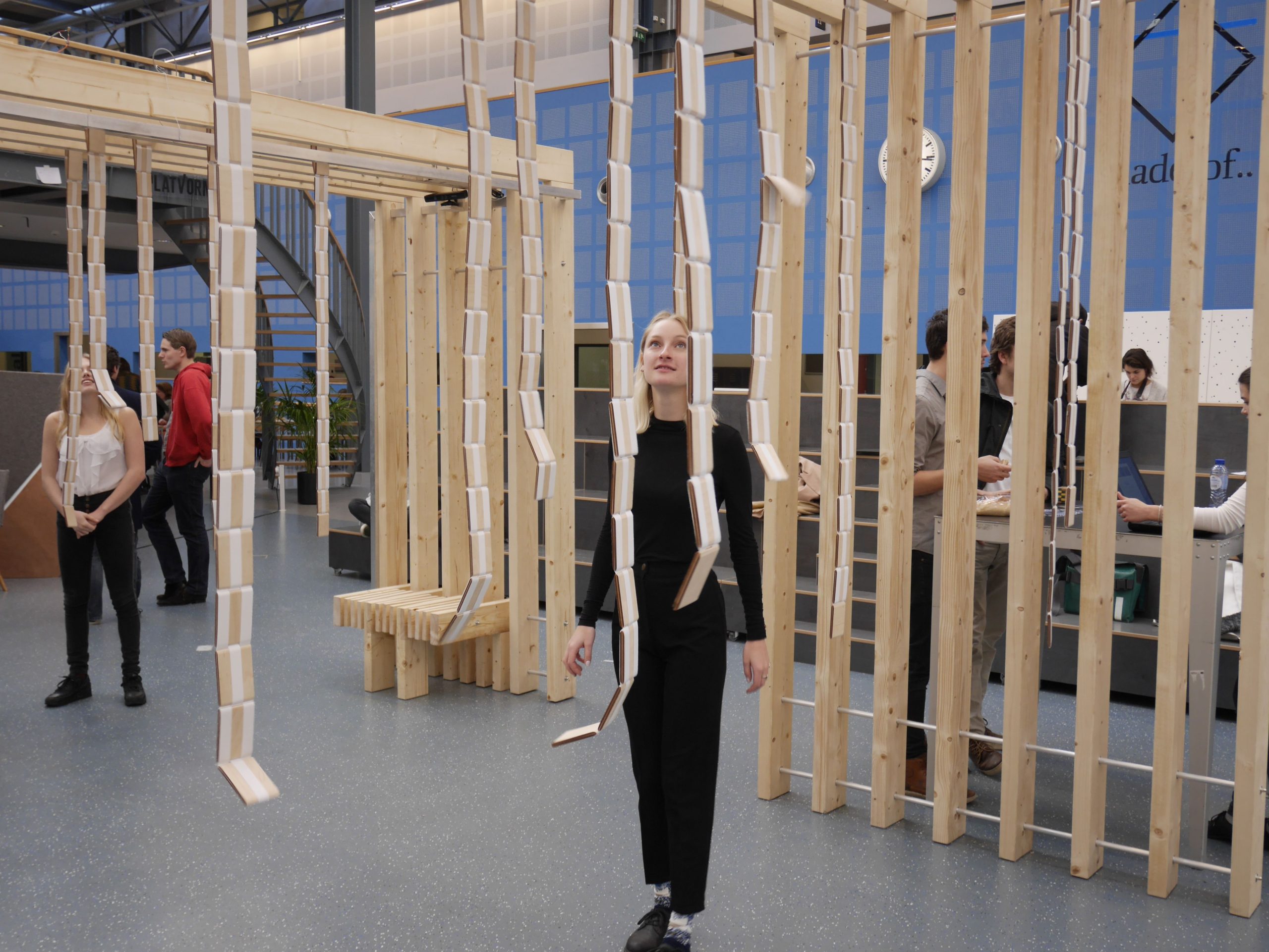 Voor de minor interactive environments zocht het team van derdejaars studente bouwkunde Eva Ventura naar een manier om passagiers op Schiphol even tot rust te laten komen. De studenten ontwikkelden Skala, een houten installatie van Jakobsladders. Dit zijn rijen plankjes waarbij elk plankje zodanig aan een ander plankje is bevestigd dat ze aan beide kanten scharnieren. Door het bovenste plankje via een motortje te laten kantelen, lijkt het net alsof dit plankje van boven naar beneden ‘rolt’.