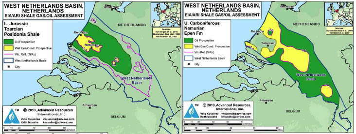 Nederland kent twee lagen met schaliegas- (en schalieolie)potentieel. De bovenste, jongere Posidonia laag (blauw) lijkt vooral olierijk. De oudere Geveriklaag (groen) is volgens prof. Stefan Luthi (TU Delft) het meest waarschijnlijke gebied voor schaliegaswinning in Nederland.